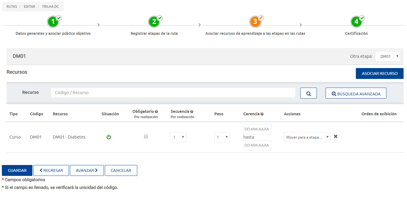Na associação do recurso de aprendizagem na trilha é possível configurar a Obrigatoriedade onde os recursos marcados limitam a passagem do aluno para próxima etapa. Ex.: Só posso realizar a etapa 2 após realizar todos os recursos obrigatórios da etapa 1.