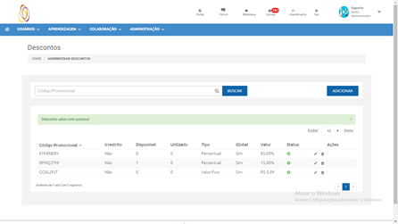 Em Administrar descontos, você poderá visualizar todos os descontos criados, seus tipos, se estão disponíveis ou não, quantas vezes foram utilizados, valor ou porcentagem aplicada, assim como seu status.