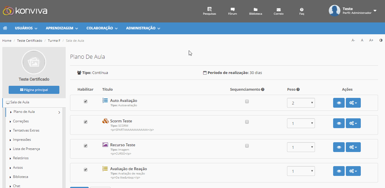 A configuração de sequenciamento permite definir a obrigatoriedade de realização dos conteúdos e se marcado de forma linear, estabelece uma sequência da exibição e realização do conteúdo.