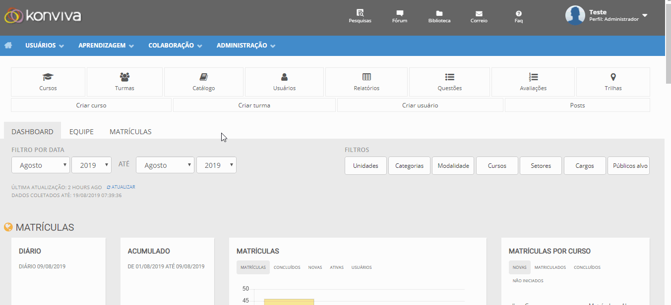 São listados todos os alunos que foram previamente matriculados, podendo ter status de matriculado ou concluído com situação de ativo ou inativo. O botão “Atualizar aproveitamento” é recomendado quando um curso sofre alteração nos pesos dos objetos de aprendizagem no conteúdo. O botão “Copiar Matrícula” permite copiar a matrícula para um outro curso, não sendo copiado as informações de aproveitamento e aprovação do aluno.