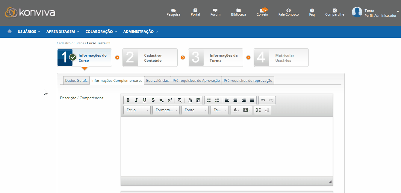 Aqui você pode adicionar uma descrição do curso, objetivo, descrever os conteúdos que serão aplicados e a metodologia. É possível ainda adicionar um vídeo institucional, imagem de fundo para o curso (com as proporções recomendadas em 1920px por 467px, com extensões JPG ou PNG), e também é possível associar autores no curso, sendo que esse perfil pode cadastrar conteúdos no curso.