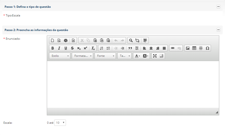 É composta por uma única questão, criada a partir do banco de questões, para que o aluno possa atribuir a si mesmo uma nota, numa escala que pode ir de 0 a 10 (configurável na criação da avaliação). O aproveitamento neste item corresponde à nota que o aluno atribuiu a si mesmo, variando de 0 a 100%.