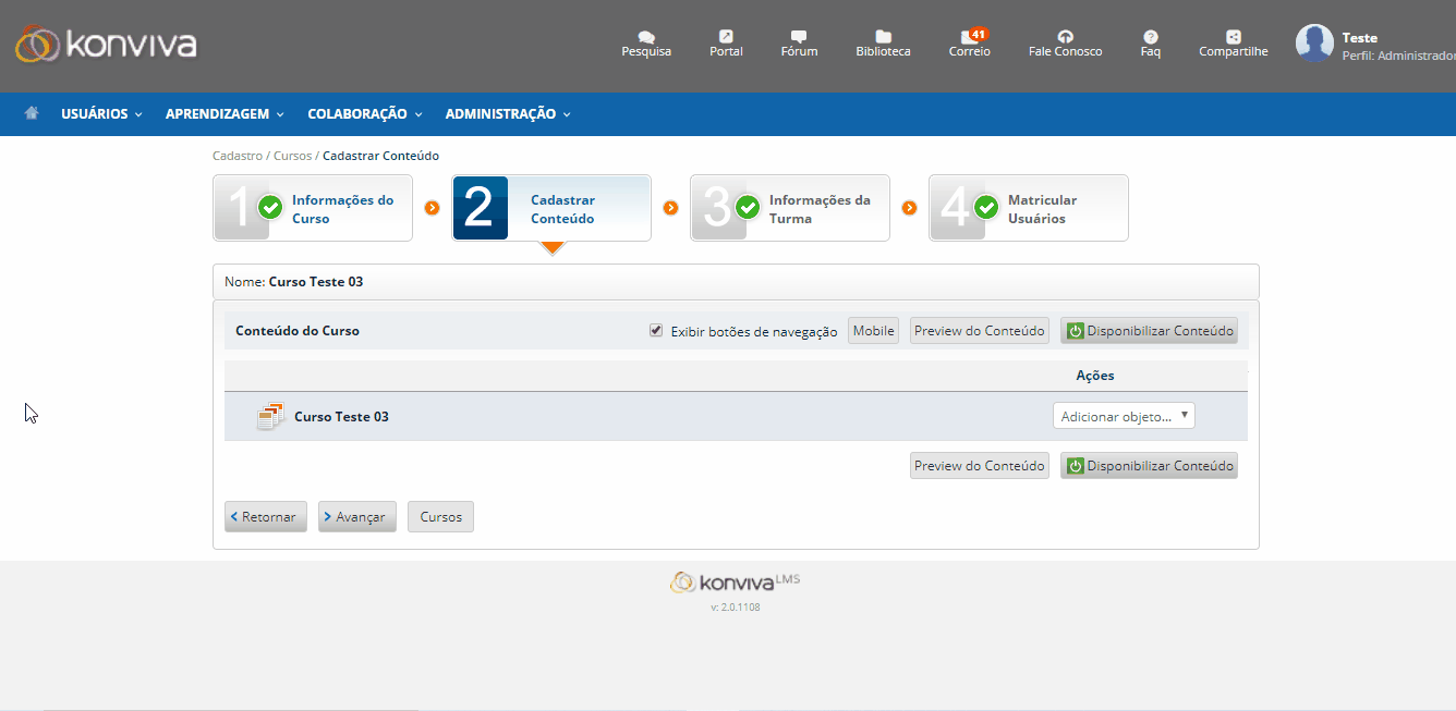 - Na etapa publicar conteúdo, selecione o objeto de aprendizagem do tipo avaliação de aprendizagem;