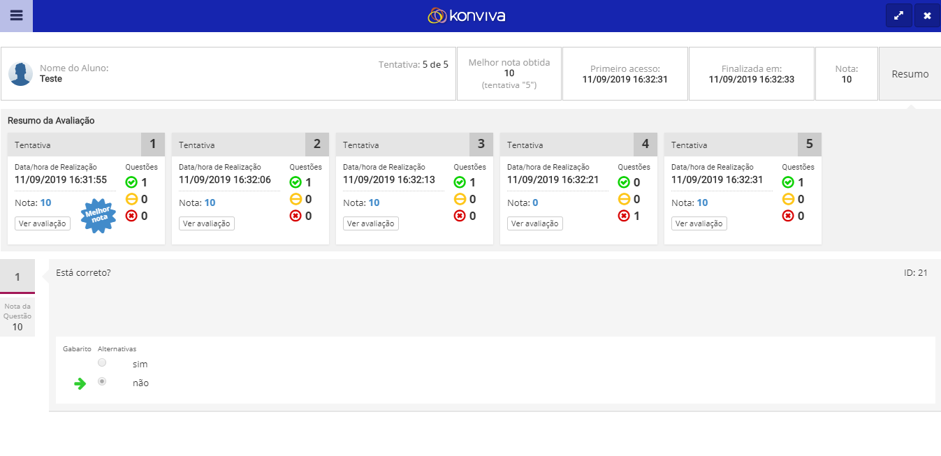 - Exibir resumo da avaliação entre tentativas: exibe o resumo da avaliação entre as tentativas realizadas.
