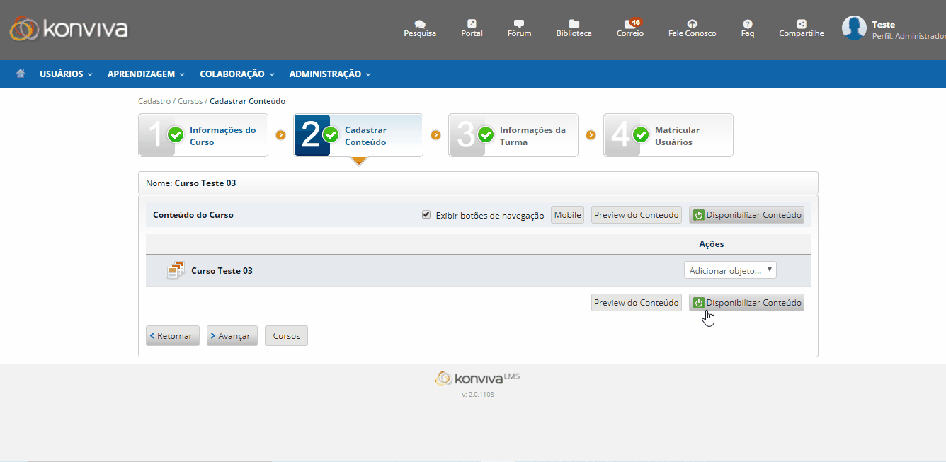 - Na etapa publicar conteúdo, no menu Ações, selecione o a opção Certificado.