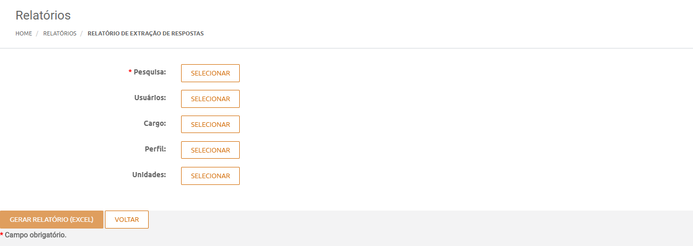 Para extrair relatórios detalhados referentes às pesquisas aplicadas, acesse o menu Aprendizagem > Relatórios, procure por Pesquisa Avulsa e clique em Relatório de Extração de Respostas. Selecione a pesquisa da qual quer se gerar o relatório e, se desejar, aplique os filtros Usuários, Cargo, Perfil e Unidades para delimitar as respostas que se quer verificar.