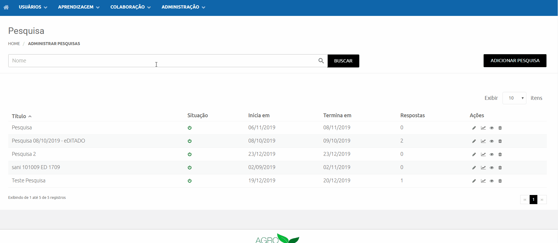 Para adicionar uma pesquisa acesse o menu Administração > Pesquisa > Adicionar Pesquisa. Quando a obrigatoriedade é configurada, o aluno será obrigado a terminar a pesquisa para que consiga fechar a janela da própria pesquisa. É possível configurar a data de início da disponibilização e a data de término. Não há limite de questões a serem inseridas, sendo que as questões podem ser de única escolha, múltipla escolha e dissertativa. Estão disponíveis os filtros "Perfil", "Público-Alvo" e 'Unidade" para especificar para quais usuários da plataforma a pesquisa deve ser direcionada.