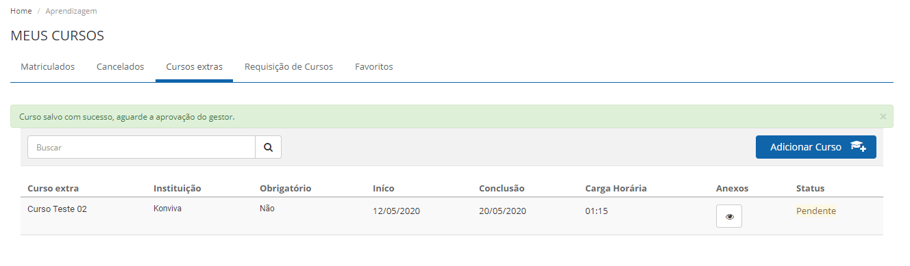 É uma funcionalidade que tem como opção cadastrar um curso que foi realizado fora da Plataforma, e possui certificado. É possível cadastrar esse curso tanto como Administrador como Aluno.
