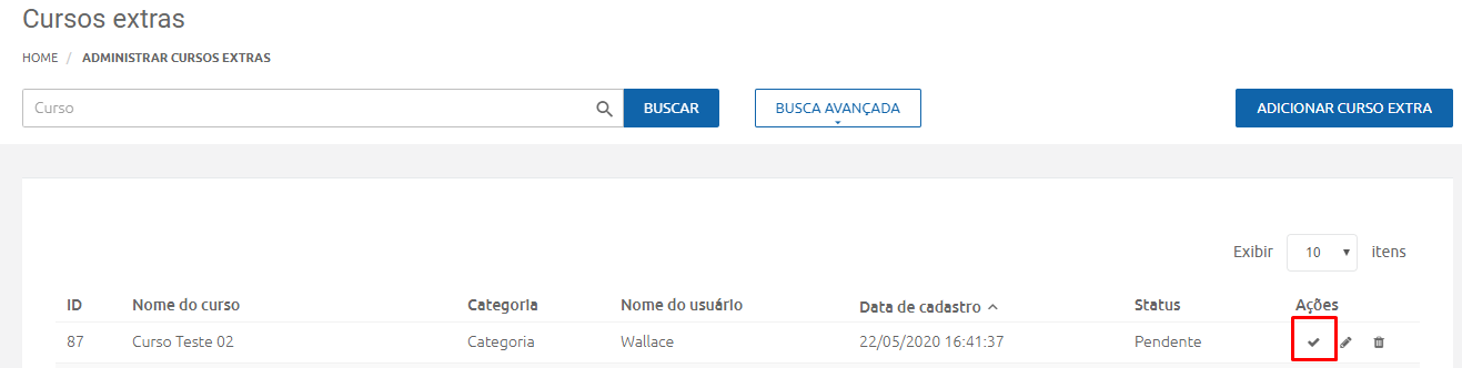 Para criar cursos ou aprovar cursos que foram cadastros por usuários, você deve acessar o menu Aprendizagem>Cursos Extras>Administrar Cursos extras