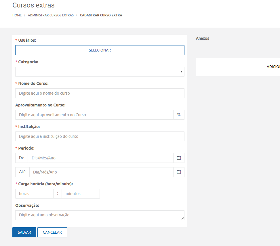 Aqui será possível preencher os dados do Curso como nome, aproveitamento(que deve ser compatível com o certificado, nome da Instituição e etc. E também é possível inserir o certificado através do anexo.