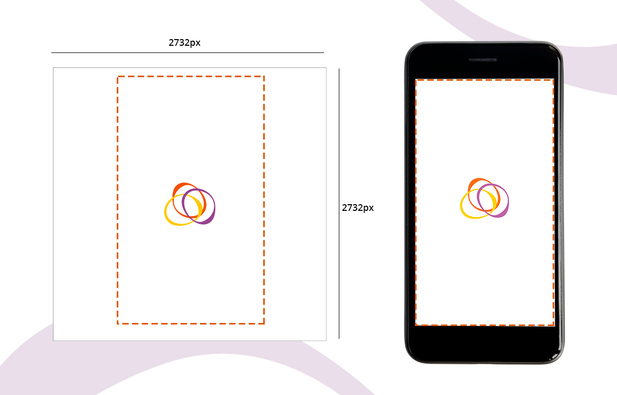 4. Tela inicial: essa tela normalmente é exibida enquanto o aplicativo está carregando para abrir. Uma imagem para uma tela inicial deve ter 2732x2732px de tamanho, sem formato png SEM transparência. Recomendamos que seja usado o logotipo ou o ícone que identifique seu aplicativo, ele deve ser posicionado no centro, em tamanho pequeno. É importante também que não seja usado como elemento de plano de fundo, como degradados e elementos vazados, pois eles não se encaixam na proposta dessa tela.