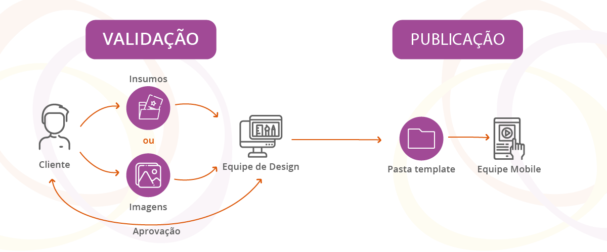 O processo de fechamento dessas imagens possui dois momentos, o primeiro é a validação e envolve uma equipe de design. Já o segundo é de publicação e envolve nossa equipe móvel. Na primeira etapa ou no cliente tem duas opções: