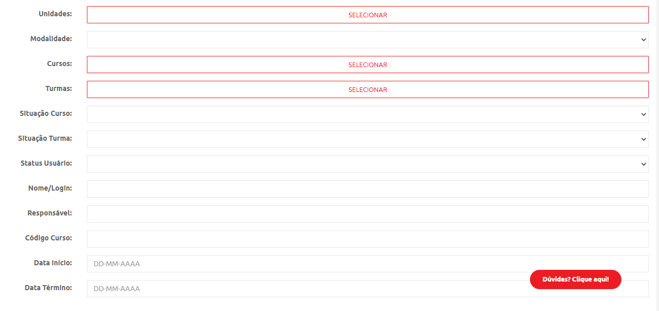 Quando selecionado o relatório, você poderá preencher os filtros existentes no mesmo caminho de Aprendizagem>Relatórios :