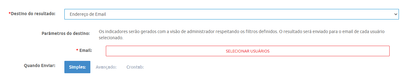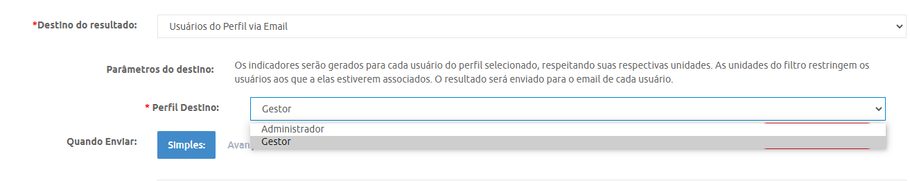 Após o preenchimento, ou não, dos filtros listados, selecione o tipo de envio em "Destino do resultado". Caso você deseje enviar o relatório para todos os Gestores cadastrados no seu ambiente, selecione o tipo "Usuários do Perfil via E-mail". Os indicadores serão gerados de acordo com que cada Gestor/Administrador pode visualizar em seu perfil.
