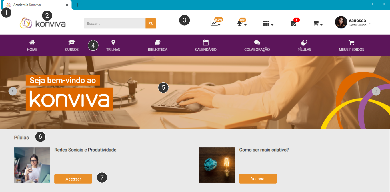 4. Trilhas: trilhas das quais o usuário está participando, ficam ao lado de Meus Cursos, logo abaixo de Pílulas.