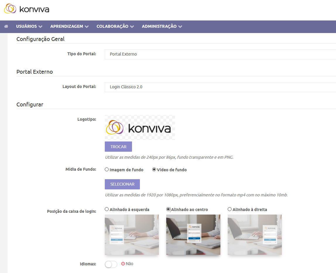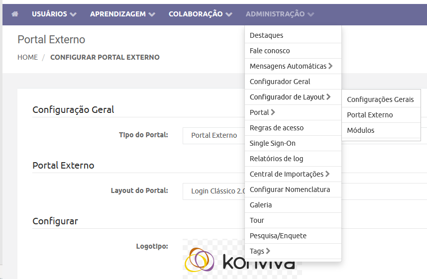 Esta opção está disponível no menu Administração>Configurador de Layout>Portal Externo.