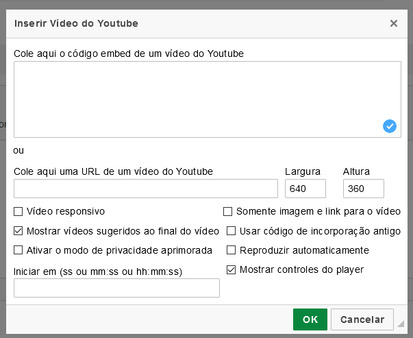 Perceba que é possível fazer alguns ajustes muito rápidos, como largura e altura, responsividade do vídeo, ocultar sugeridos do Youtube ao final do vídeo, mostrar os controles do player e, inclusive, definir em qual segundo o vídeo deve começar a rodar.