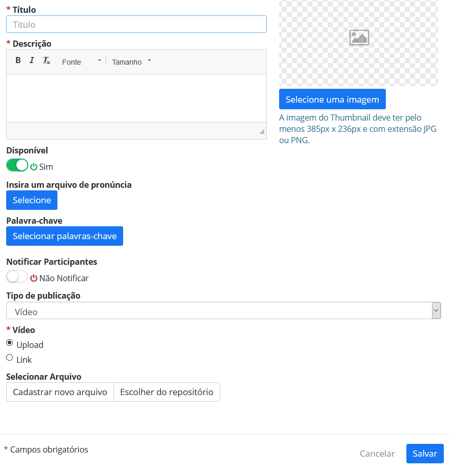 Na publicação do item também é possível fazer upload de uma imagem (thumbnail) que será mostrada na Biblioteca. O tamanho da imagem do thumbnail deve ser 385px x 236px.