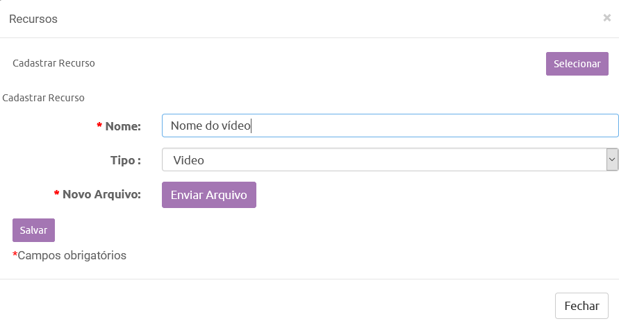 Em arquivo, na biblioteca, além de outros formatos, é possível subir vídeo como Recurso e permitir a sua visualização ou download pelo aluno.