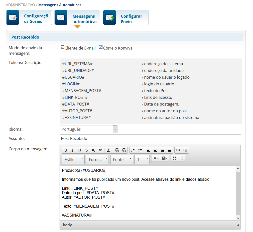Como administrador, você pode escolher enviar a publicação para o e-mail ou correio dos usuários, conforme configurado nas Mensagens automáticas, na aba Ferramentas.