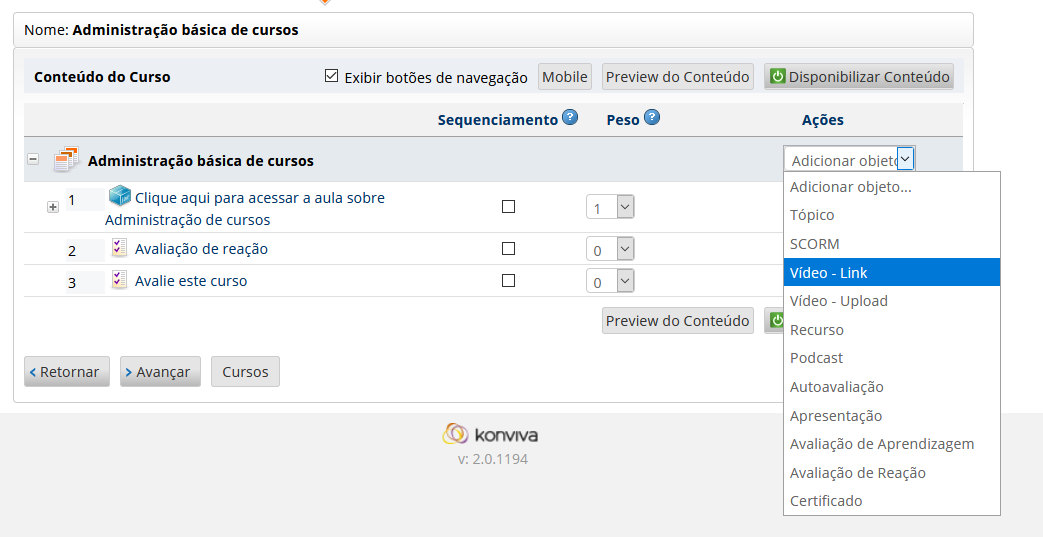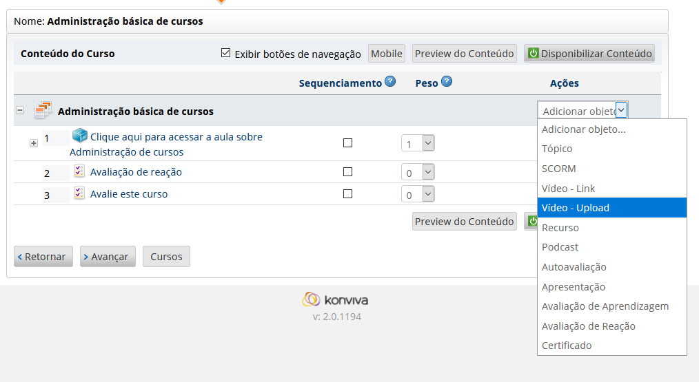 Além dos formatos que já vimos anteriormente, vídeo-link e vídeo-upload, o vídeo pode ser incluído na árvore de conteúdo para ser exibido na sala de aula em SCORM, e também como Tópico.