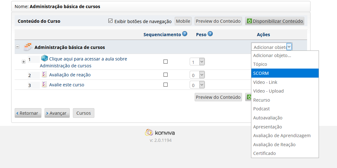 Para subir o scorm, basta clicar em Adicionar conteúdo e seguir as orientações, realizando todas as configurações de acordo com as necessidades de aprendizagem da sua organização.