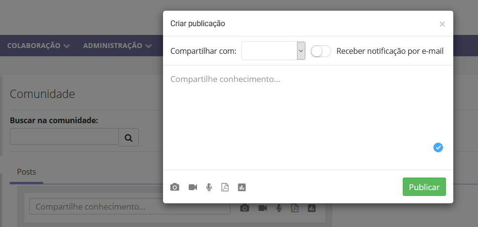 No post do administrador, é possível compartilhar vídeo direto da máquina do usuário.
