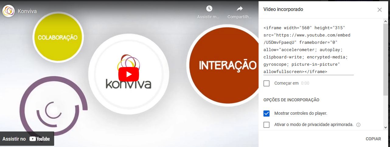 Em Destaques, é possível colar um código de incorporação do vídeo para abrir direto dentro do Konviva ou, simplesmente, colar a URL do vídeo do Youtube.